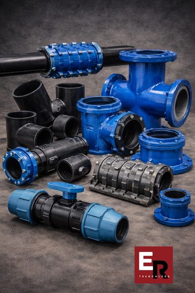 Suministro de piezas especiales para redes sanitarias, industriales y de agua potable, en materiales de alta calidad como HDPE, hierro dúctil y acero, adaptadas a cada requerimiento de obra.